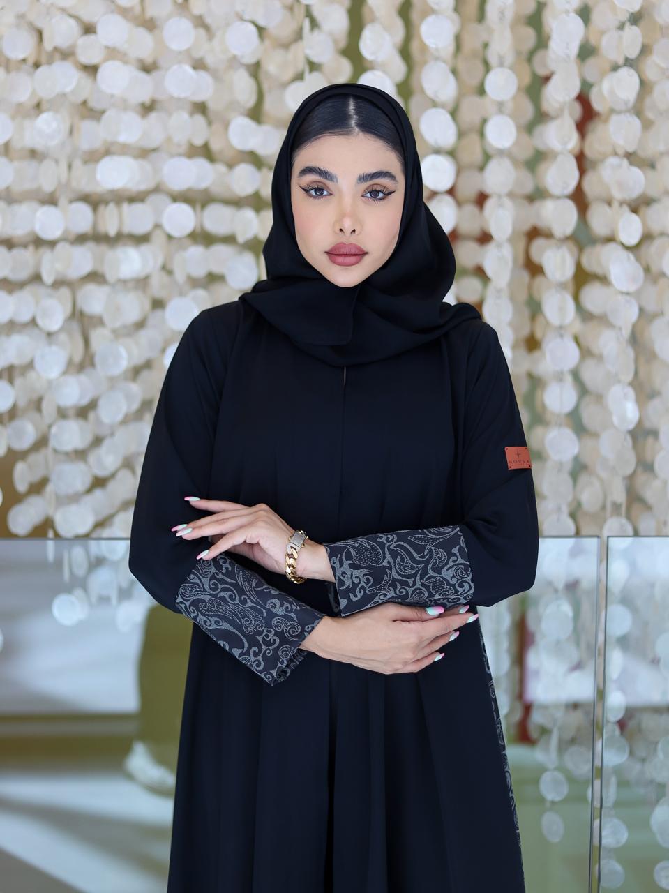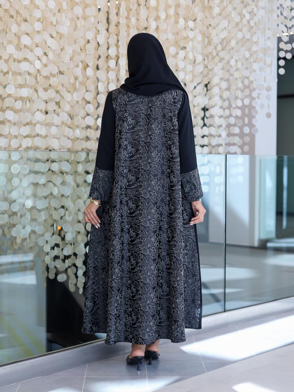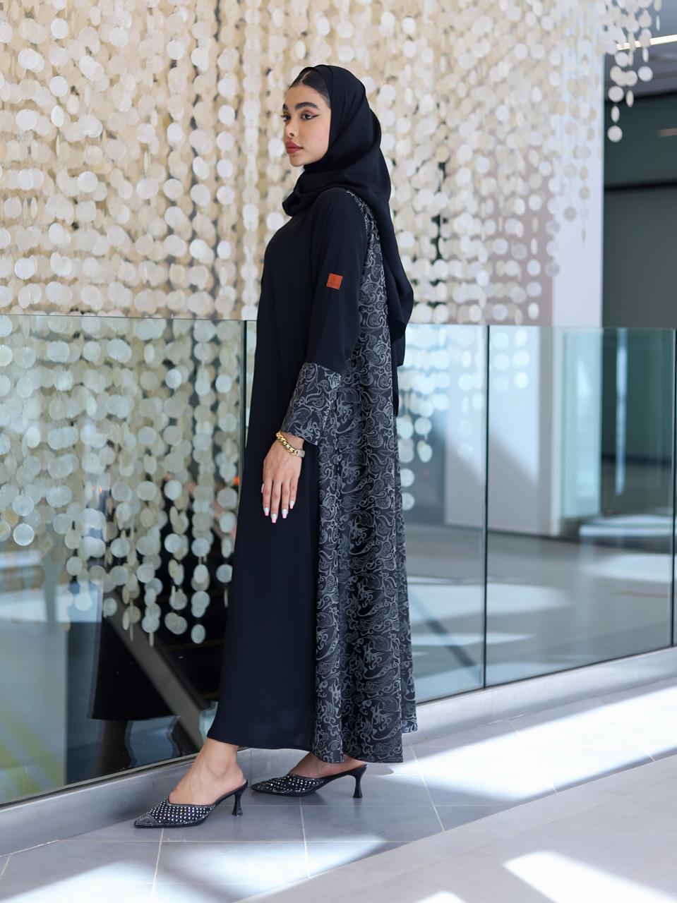 عتمة السواد وبريق الزخرفة، في لوحة تنطق بالأناقة الراقية. اللمسات الفضية تضيف عمقًا وأناقة عصرية تناسب المرأة العملية التي لا تتنازل عن ذوقها الرفيع.
