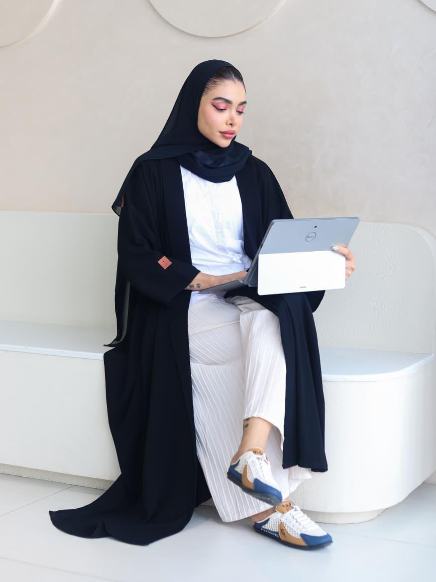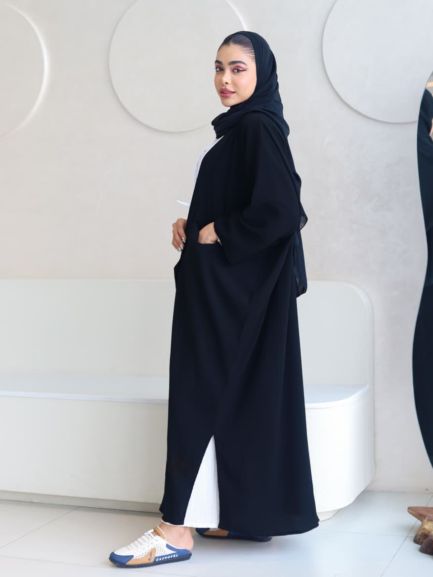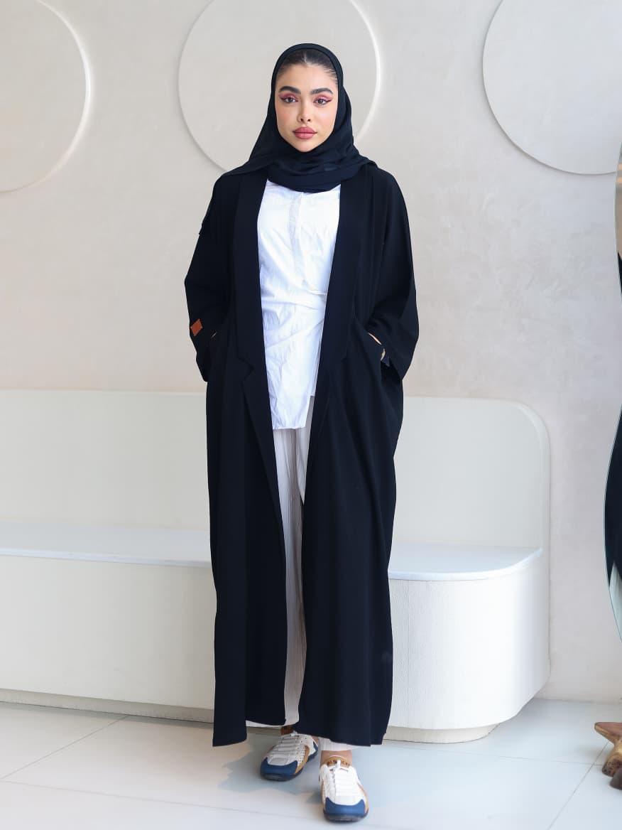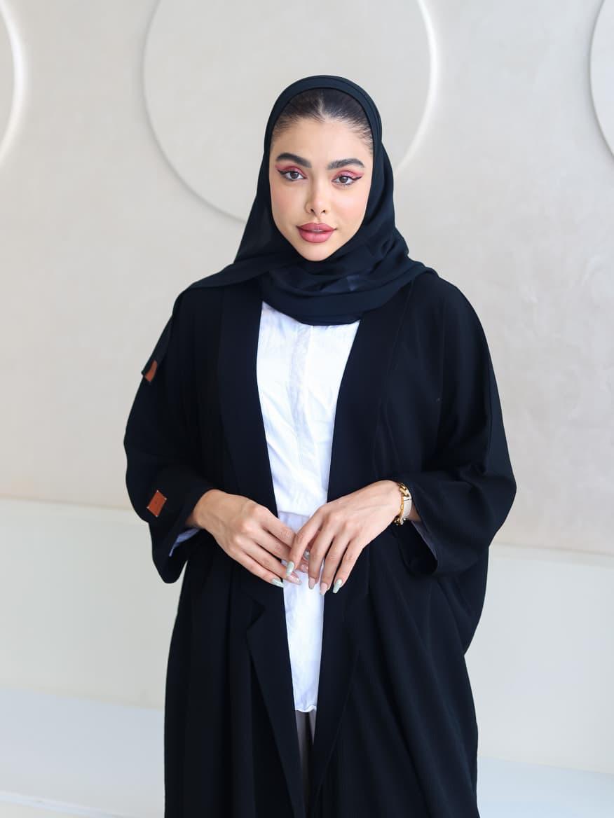 عباية سوداء عملية بلمسة عصرية، مثالية للإطلالة اليومية المريحة مع الحفاظ على الأناقة.