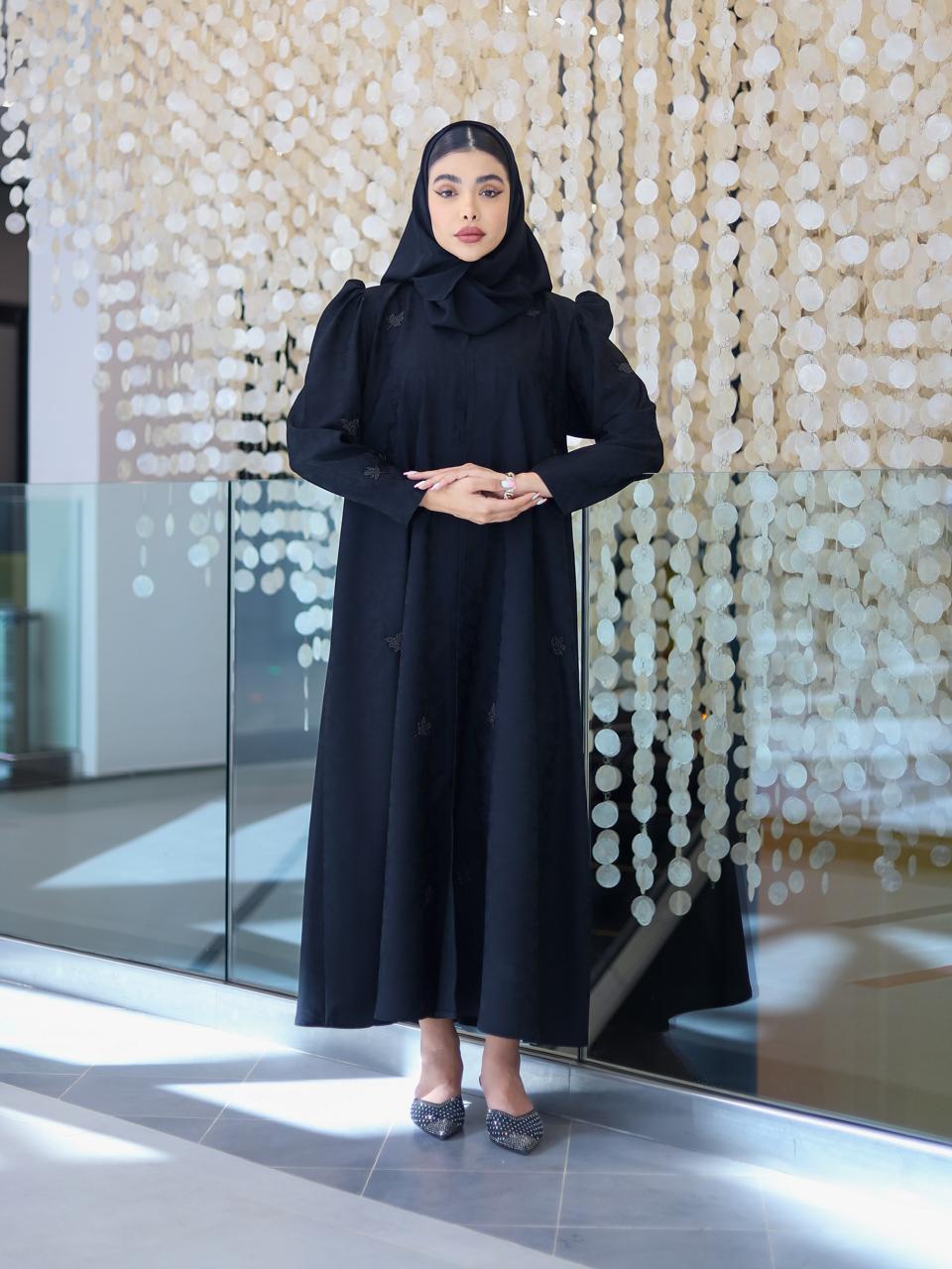 • عباية باللون الأسود بنقوش ناعمة مطرزة بشكل أوراق صغيرة